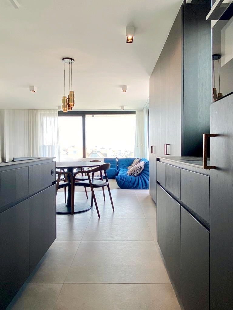 Voor de inrichting van dit appartement in Knokke, met een prachtig uitzicht op de wijde omgeving, is gekozen voor luxueuze materialen zoals fineer, grootformaat tegels en messing. Deze materialen dragen bij aan een verfijnde en elegante uitstraling van het interieur, en benadrukken de exclusiviteit van de woning. Met oog voor detail en kwaliteit zal het appartement een sfeer van tijdloze luxe uitstralen, passend bij de exclusieve locatie in Knokke.